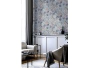 Jemně plastická, modrá pololesklá vliesová tapeta s vinylovým povrchem - motivy listů a rozkvetlých větviček v odstínech šedé, hnědé, béžové, modré a vínové.