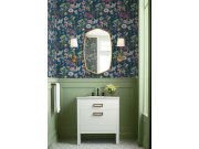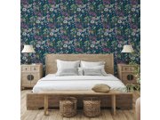 Tmavě modrá vliesová tapeta na zeď, květiny a motýli v odstínech zelené, růžové, šedé a hnědé.