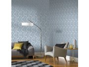 Modrá vliesová tapeta s hladkým papírovým povrchem, stříbrné geometrické vzory.