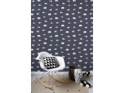 Vliesová tapeta pro kluky - auta, jeřáby, vrtulníky, tmavě modrý podklad, bílý vzor.