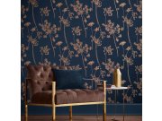 Tmavě modrá strukturovaná vliesová tapeta s vinylovým povrchem, bronzové motivy stromů, listů.