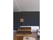 Modrá vliesová tapeta s vinylovým povrchem, motivy listů s bronzovými obrysy.