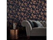 Tmavě modrá strukturovaná vliesová tapeta s vinylovým povrchem, bronzové motivy stromů, listů.
