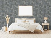 Jemně plastická, modro-šedá geometrická vliesová tapeta s vinylovým povrchem, 3D imitace obkladů, stříbrné detaily.
