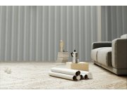 Jemně plastická, pruhovaná, modro-šedo-hnědá, vliesová tapeta s vinylovým povrchem, místy metalické stříbřité odlesky.
