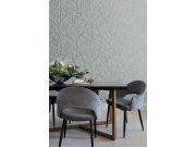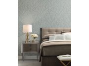 Vliesová tapeta na zeď, světlý šedo-modrý podklad, smetanově bílé listy se stříbrnými plastickými obrysy.