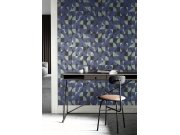 Luxusní, jemně plastická, geometrická vliesová tapeta na zeď, odstíny modré, černé a pololesklé zelené.