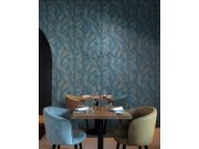 Jemně plastická vliesová tapeta na zeď, motivy listů v odstínech modré se zlatými obrysy.