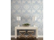 Modrobílobéžová hladká předklížená tapeta na zeď, ornamentální zámecký damaškový vzor.