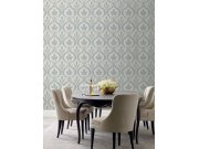 Modrobílá hladká předklížená tapeta na zeď, ornamentální zámecký damaškový vzor.