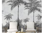 Luxusní vliesová obrazová tapeta v šedých tónech s motivem palem. Na pozadí loga PP. Podklad s hrubou textilní strukturou.