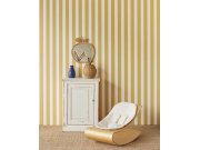 Žíhaná tapeta ve žlutém odstínu s jemným leskem.