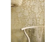 Krémová vliesová tapeta s vinylovým povrchem, motivy tropických listů v odstínech zelené a okrové, místy se zlatými odlesky.