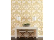 Žlutá předklížená tapeta na zeď, bílý jemně plastický zámecký damaškový vzor.