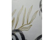 Krémová vliesová tapeta s vinylovým povrchem, motivy tropických listů v odstínech šedé a okrové, místy se zlatými odlesky.