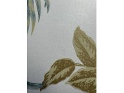 Krémová vliesová tapeta s vinylovým povrchem, motivy tropických listů v odstínech zelené a okrové, místy se zlatými odlesky.