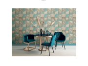 Odolná, omyvatelná, vinylová tapeta na zeď, odstíny hnědé a tyrkysové se zlatobéžovými odlesky. Věrná imitace obkladů, rozměr cca š. 18 x v. 16 cm.
