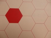 Vliesová tapeta. Vzor červených hexagonů na světle oranžovém podkladu.