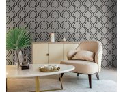 Luxusní vliesová tapeta na zeď v bílo-stříbrném odstínu se vzorem kamínků a jemným leskem a výrazným černým vzorem ve stylu Art Deco. Moderní vliesové tapety do ložnice.