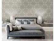 Luxusní vliesová tapeta na zeď v šedo-stříbrných odstínech se vzorem kamínků a jemným leskem a výrazným stříbrným vzorem ve stylu Art Deco. Moderní vliesové tapety do ložnice.