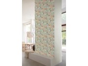 Vliesová tapeta na zeď, motivy květin v odstínech zelené, tyrkysové, cihlově červené a béžové. Jemná krupičková textura.