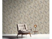 Luxusní písková vliesová tapeta s vinylovým povrchem, efekt jemné textilie s rozkvetlými větvičkami v odstínech metalické zlaté, hnědé a šedo-modré.