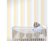 Současné trendy nadčasovým pruhům a proužkům přejí. Jsou kombinovatelné se vzorovými i jednobarevnými tapetami, nebo samostatně dokáží vymezit a zútulnit prostor. Dětská pruhovaná bílo-šedo-žlutá papírová tapeta na zeď.