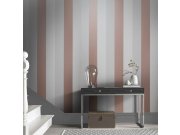 Hladká vliesová tapeta s papírovým povrchem - pruhy v odstínech růžové, béžové a metalické měděné. Tapetu lze lepit vodorovně i svisle.
