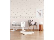 Hladká bílá vliesová tapeta na zeď, motivy zvířátek a listů v odstínech růžové, béžové, šedé a hnědé.