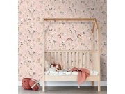 Růžová dětská vliesová tapeta, motivy kytiček a zajíčků. Tapeta má látkovou texturu, je vhodná do dětského pokojíčku pro nejmenší děti.