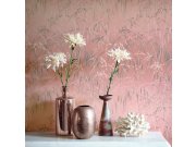 Pololesklá růžová vliesová tapeta na zeď, motivy luční trávy v odstínech růžové a šedo-stříbrné.