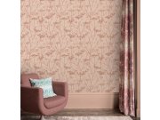 Jemně plastická, starorůžová pololesklá vliesová tapeta s vinylovým povrchem - motivy rozkvetlých větviček a ptáčků v odstínech vínové, béžové, zelené a zlaté. Foto interiéru je pouze ilustrační - odlišné barvy.