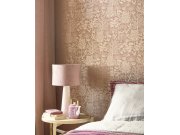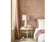 Jemně plastická, starorůžová pololesklá vliesová tapeta s vinylovým povrchem - motivy rozkvetlých větviček a ptáčků v odstínech vínové, béžové, zelené a zlaté. Foto interiéru je pouze ilustrační - odlišné barvy.