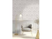 Krémová vliesová tapeta s vinylovým povrchem, růžovo-béžový pololesklý zámecký damaškový vzor. Foto interiéru je pouze ilustrační - odlišné barvy.