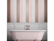 Hladká vliesová tapeta s papírovým povrchem - pruhy v odstínech růžové, šedé a metalické/růžové zlato. Tapetu lze lepit vodorovně i svisle.