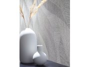 Šedá vliesová tapeta na zeď s vinylovým povrchem inspirovaná palmovým listem, která je zajímavá především kontrastem jemných metalických linií na matném podkladu.