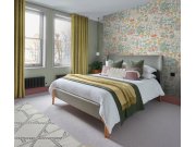 Vliesová tapeta na zeď, podklad šedý, květiny v odstínech žluté, růžové, modré a zelené.