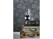 Šedá vliesová tapeta na zeď, květinový vzor v odstínech šedé, modré a hnědé.