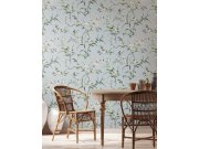 Vliesová květinová tapeta na zeď, rozkvetlé větvičky v odstínech zelené, bílé a růžové, šedý podklad.
