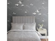Šedá vliesová tapeta s motivem letících čápů na hladkém podkladu vnese do interiéru klidnou atmosféru.