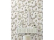 Bílá vliesová tapeta na zeď, květinový vzor evokuje malbu akvarelem, odstíny šedé a béžové, metalické detaily.