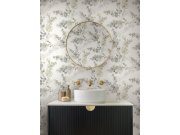 Bílá vliesová tapeta na zeď, květinový vzor evokuje malbu akvarelem, odstíny šedé a béžové, metalické detaily.