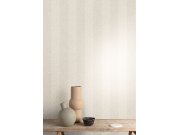 Jemně strukturovaná vliesová tapeta na zeď, imitace tvídové pruhované látky, odstíny pískové / šedo-béžové, metalické odlesky. Pruhy cca 6-7 cm. Foto interiéru je pouze ilustrační - odlišné barvy.