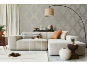 Plastická, šedo-béžová vliesová tapeta na zeď, geometrický vzor, zlaté linie tvoří kosočtverce.