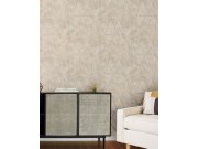 Krémová vliesová tapeta na zeď, rostliny a listy v odstínech hnědé, šedé a béžové, zlaté obrysy.