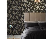 Vliesová tapeta s kvalitním papírovým povrchem - matný šedo-černý podklad, metalické zlatavé obrysy větviček s listy.