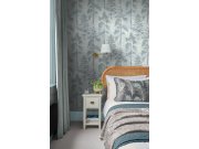 Šedo-modrá vliesová obrazová tapeta s motivem listů a stromů. Foto interiéru je pouze ilustrační. Pro větší šířku lze kombinovat s fototapetami DG3MOE1022, DG3MOE1023 a DG3MOE1024 - viz foto