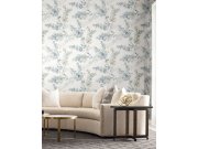 Světle modrá vliesová tapeta na zeď, jemně plastické květy dřínu v odstínech bílé, béžřové, modré a zelené.