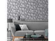 Jemně plastická vliesová tapeta na zeď, šedý podklad, šedo-stříbrné květiny a listy. Foto interiéru je pouze ilustrační - odlišné barvy.