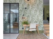 Jemně strukturovaná vliesová tapeta na zeď, odstíny šedé a zelené, na listech metalické linie. Foto interiéru je pouze ilustrační - odlišné barvy.